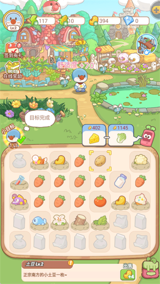 1、游戏初期通过拖动合并胡萝卜等作物,开启模拟经营的合成玩法。