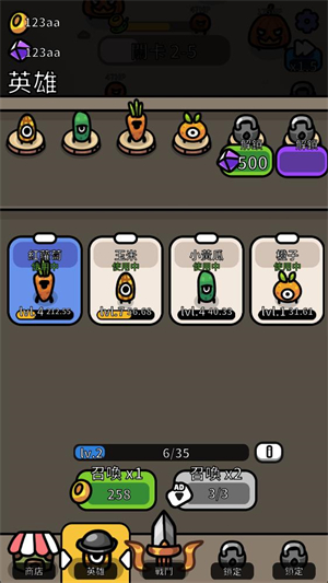 2、点击下方的英雄按钮可以召唤不同的水果,召唤后你可以选择上阵或者用来强化其他水果。