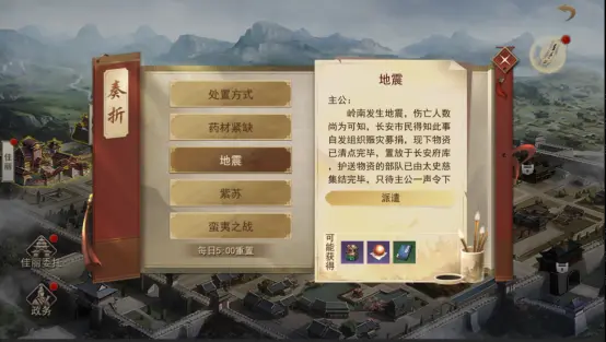每日,城内会出现较多的委托内容需要玩家处理,主公可以派遣佳丽代而完成城内的委托,不同的委托,对派遣者的需求也并不相同,若能符合他们的派遣需求,将有更大的几率获得额外奖励。