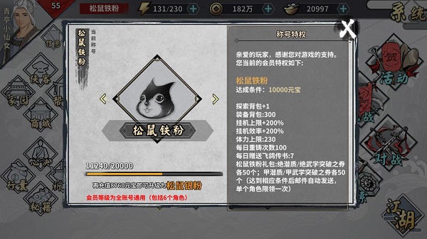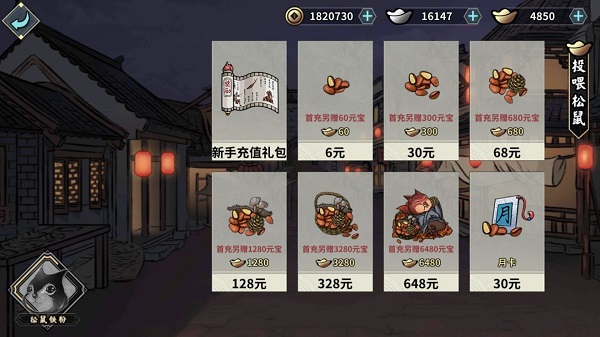 礼包类:50元宝1个珠子+100体力的每日金元宝礼包,1280元宝20珠子的礼包,3280元宝40珠子的礼包,以及这次活动中包含松鼠徽章的礼包
