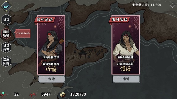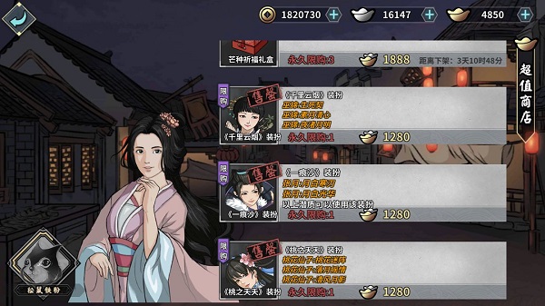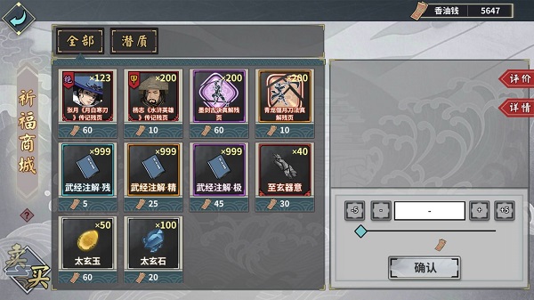 如上图所示,绝和武经注解.极都是购买的不二之选,但是如果你是萌新,就不要想着买侠客和武学了。老老实实买武经注解.极,等你差不多800本极了再考虑买侠客和武学吧,800本极如果不用张月和野驴是够了的。注意,香油商店只买绝和武经注解.极这两个东西,其他的一律不要买,除非出售的甲武学很强,但是你又没有(比如甲白衣的武学)。