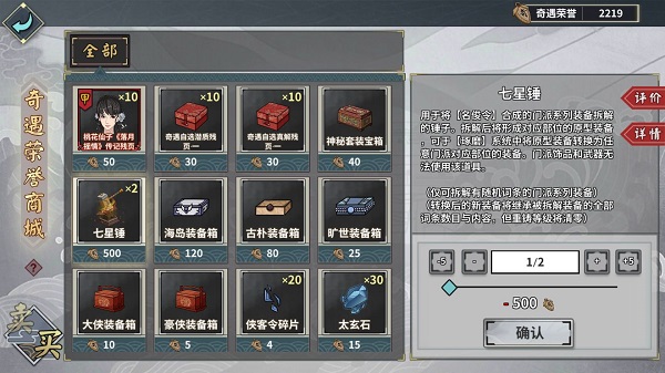 然后是奇遇商城:奇遇商城就没那么多讲究了,买名俊令,太玄玉,太玄石,奇遇自选残页,七星锤(这个萌新用不到,等你玩熟了就知道有什么用了)