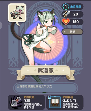 武道家也是非常不错的,奥义技能是能够对面朝方向发射多个飞镖,并且初始秘宝也是永久的增加自身10%的移速,降低敌人10%的移速,是能够让玩家们有更多的时间来获取到更多的资源奖励,以及躲避敌人的伤害的。