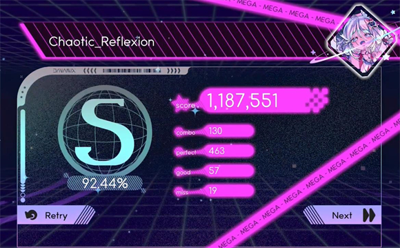 7.当打完所有音符后就会根据你的分数来判定等级。