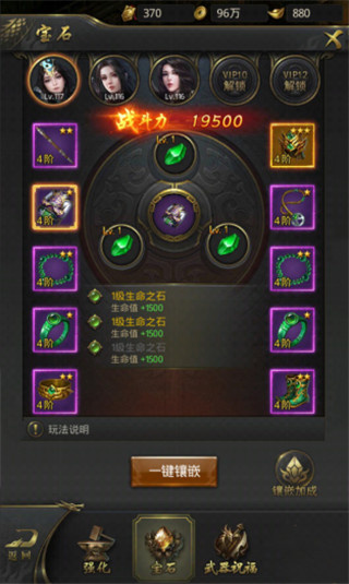 2、在宝石系统里,镶嵌宝石可以提升装备属性,当宝石升级至一定等级后就会激发属性加成,而升级宝石需要消耗相同宝石才可,当宝石升级到4至7级时,会额外提升一类属性。