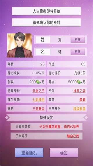 1、进入游戏后,先确认个人资料,包括姓名、年龄、气运、能力成长等属性,还可选择特殊身份、资质等设定,选好后点击【确定】正式开启游戏,你的使命是建立豪门、称霸上京、铸就百年荣光。