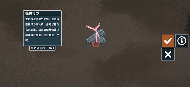 5、进入可操作界面后先是需要玩家建立风力涡轮机,在移动到合适位置后(呈现绿色后)就可以点击“√”键建立了;