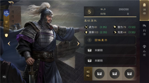 属性加点选择:曹仁全统率,许褚全先攻,夏侯渊全先攻。