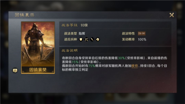 自带战法:【固镇襄樊】,指挥战法,以控制敌人和提高自身减伤为核心,有效控制敌军输出。不仅可以保证自身的前排抗伤能力,还可以对敌军施加“技穷”,减少敌军的输出机会。