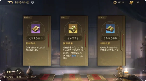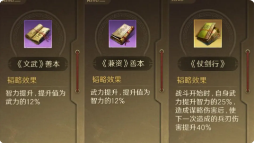 1、避免韬略重复、优先核心韬略某些韬略在战斗中只会生效一种,例如韬略《合谋》手抄的效果为:我军智力最高单体,造成伤害提升。这类带有“指向性”的韬略如果多人携带,将只会生效一本。