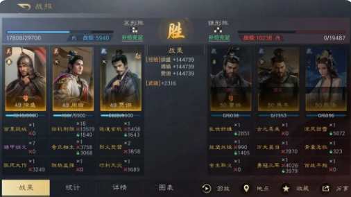 以下图战报为例,这套“天灾队”的贾诩,先发动【烈火焚营】为敌军全体施加“火攻”状态,再发动【巧利天灾】,对敌军施加“混乱”状态,这才算是一种战法配合。