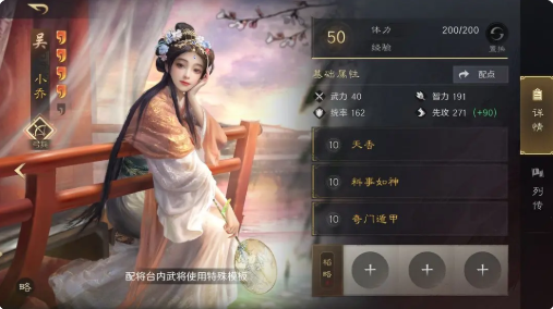 7、合理搭配武将以最大化战斗力。选择武将时需考虑属性、技能和特长。前期武将少时,推荐使用前期较易获得的徐盛+大乔+孙策的组合,保证前期战斗无忧。