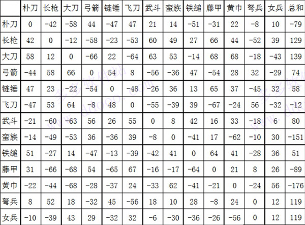 大体上,长兵器的克短兵器的,短兵器的克弓,弓克长兵器的.但也有特例,好比弩兵就克朴刀兵+8%,同种兵器之间相克程度不超过30%。