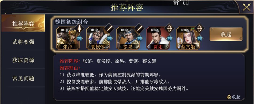 1> 获取难度较低,作为魏国控制流派的前期阵容;