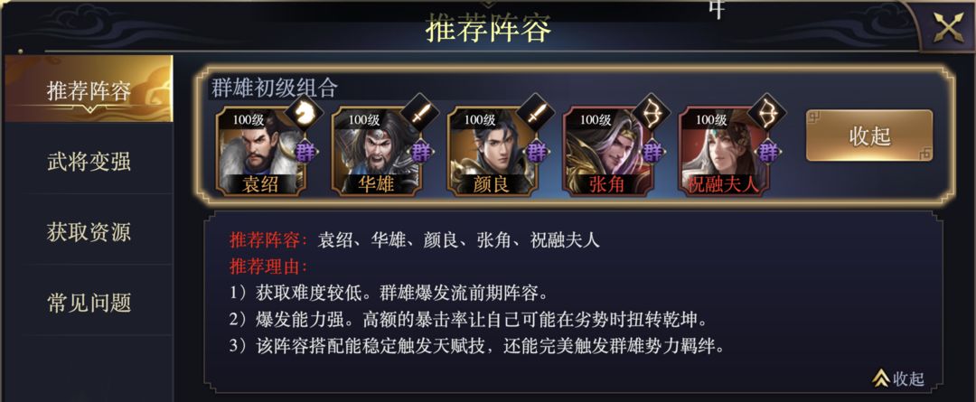 1> 获取难度较低,蜀国冲锋流派的前期阵容;