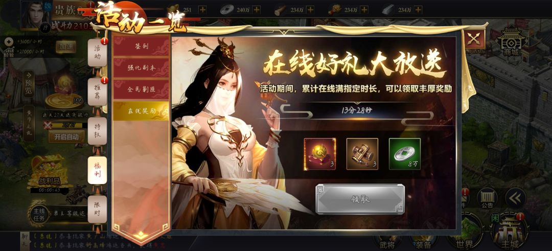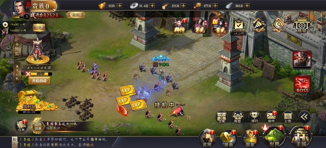 左上角的关卡挑战,还有左下角的战利品领取。关卡挑战能给你带来经验、战利品,平时没事做的时候可以开启自动挂着;战利品存了6个小时就会满,记得要早点领取哦。还有右边的敌将入侵和血战群雄,也算是每天的一个打卡任务。敌将入侵一般都选择星级挑战,每天当任务一样把次数刷完就行。