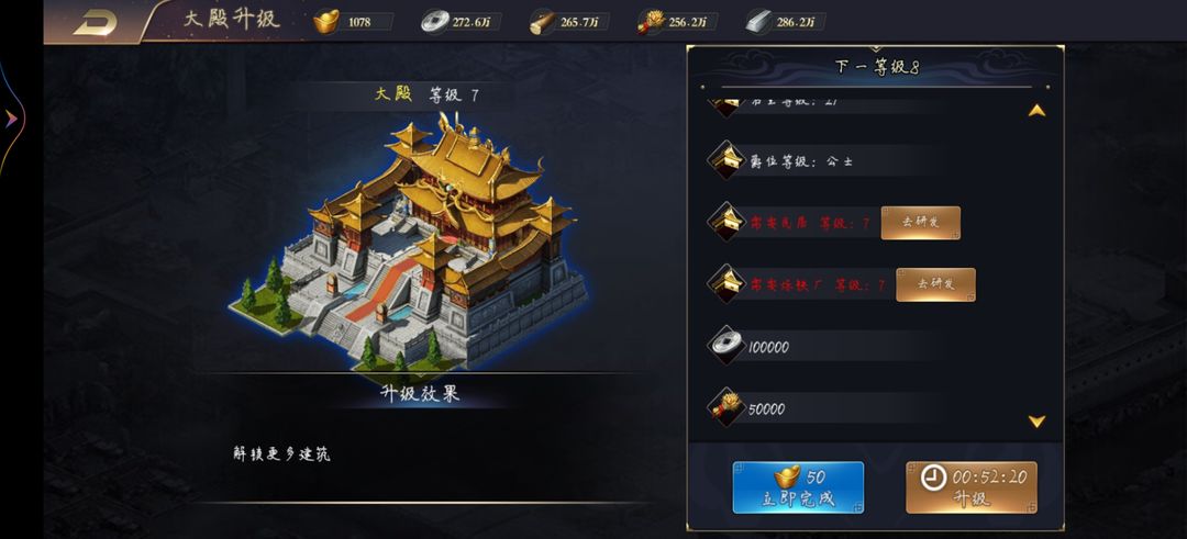 最上方的大殿是主建筑,升级了大殿你才能解锁更多建筑和功能,解除更多禁止。大殿需要君主等级、现有建筑物等级、爵位等级等达到一定条件时才可以升级,需要消耗银两、粮食、木材、铁矿(可通过主城建筑生产、城市资源采集获得)。