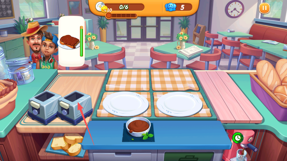 连击的每两次上菜时间间隔约两秒,可以通过关卡界面上方的圆盘倒数和连击计算条了解当前连击的情况(如上图红圈内)。最佳方案就是凑齐5个一起上,5个5个地上菜。