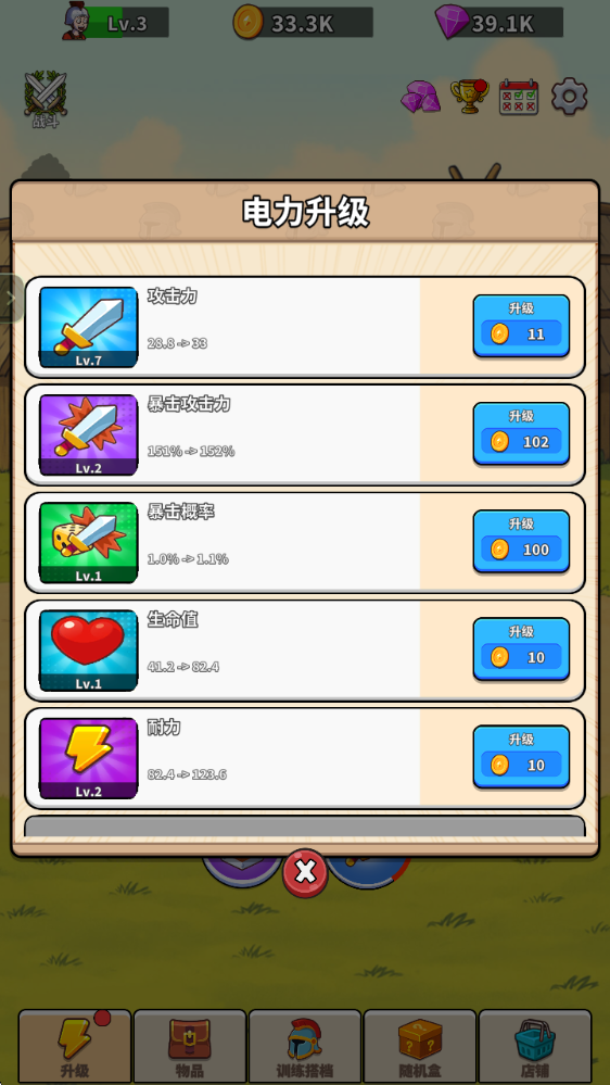 3、通过战胜对手来获得金币和经验,升级自己的各种属性。