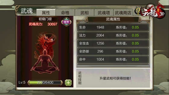 更新后,角色等级到达75级将开启【武魂】功能。玩家可以通过培养武魂,来获得自身属性、战力的提升。培养武魂主要有三个方面:等级、命格和武相。