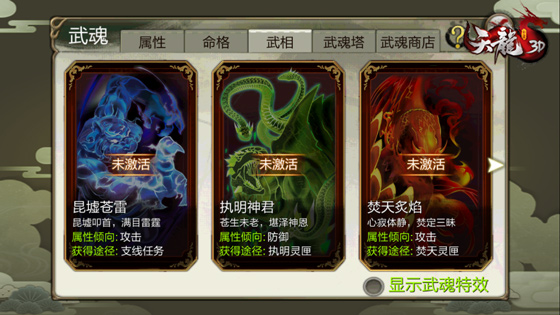 激活、升星不同武相将提供不同的炼形值,为角色提升更多战力!武相的获取方式也十分多样化,可以通过完成长白山支线任务获取【昆墟苍雷】,或通过完成日常副本灵鹫宫、怒海锄奸,打开武魂礼包后获得【昆墟苍雷】、【执明神君】、【焚天炙焰】武相碎片。