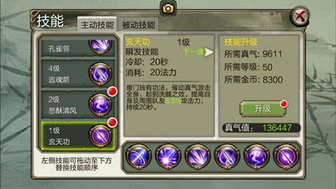 玄天功:长时间内给自己及队友增加攻击力。唐门加状态技能,增加己方战斗力。相比其他职业的加攻技能,该技能优点在于持续时间长,可使唐门一直处于加功状态,建议优先升级。