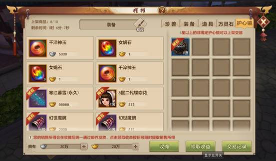 在租赁摊位后,少侠就可以将想售卖的物品上架到自己的摊位上啦。可以摆摊出售的物品有:7星以上普通二代珍兽、非绑定套装及7星以上打造装备、非绑定流通道具、非绑定紫色及以上品质万灵石和4星以上的非绑定护心镜。设定好出售价格后,对应物品就会显示到摊位已上架界面。
