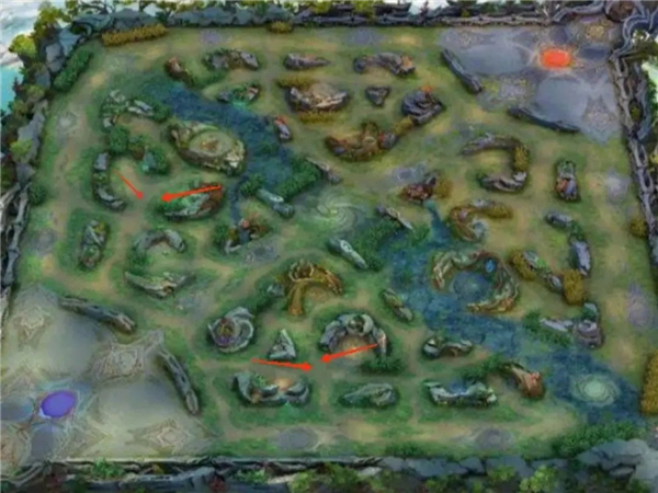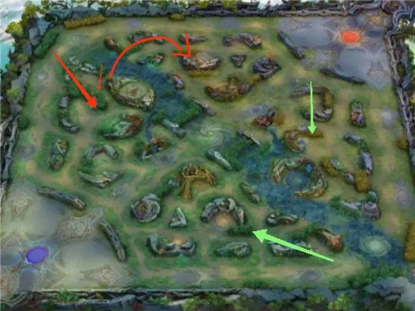 敌方打野前期弱势或者敌方阵容前期偏弱无控制。先打掉自家弹簧花跳到敌方红区(红色箭头位置),记得发信号给中路,防止被反抓了