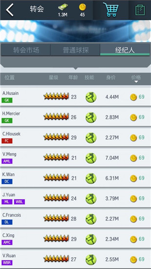在本游戏中,制作者其实也是在给玩家复现现实联赛的形式获取俱乐部希望的球员,主界面左下方的转会市场按钮是获取球员主要方式,在转会市场中分为三种方式:转会、球探和经纪人;
