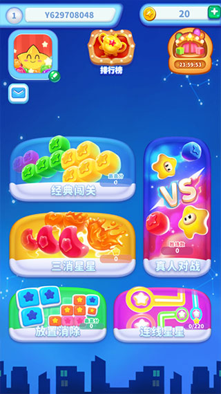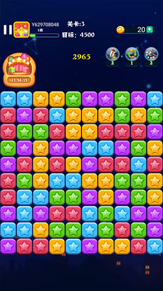 6、星星是无穷无尽的,只要消除过后,就会自动添加新的星星出现,需要不断的做出快速的判断,从而消除连接在一起的星星,让自己获得更多的分数,从而获得奖励。