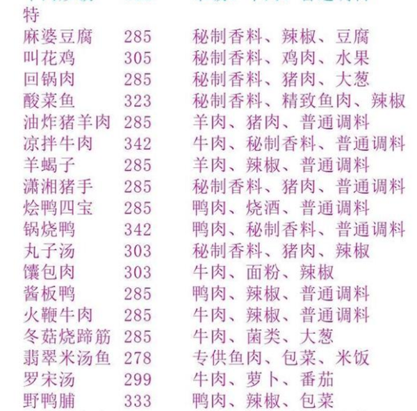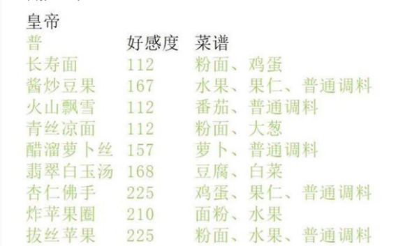 皇帝喜爱的菜谱包括:普:长寿面、酱炒豆果、火山飘雪、青丝凉面、醋溜萝卜丝、翡翠白玉汤。