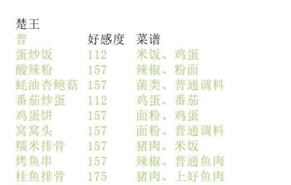 楚王喜爱的菜谱包括:普:蛋炒饭、酸辣粉、蚝油杏鲍菇、番茄炒蛋、鸡蛋饼、窝窝头、糯米排骨、烤鱼串、桂鱼排骨。