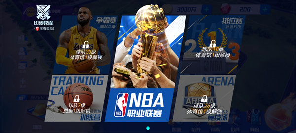 按球队等级和建筑要求,逐步解锁争霸赛、NBA职业联赛等赛事,在不同的游戏等级下,能够解锁不同的游戏参与方式,获得更多专属游戏内的奖励。