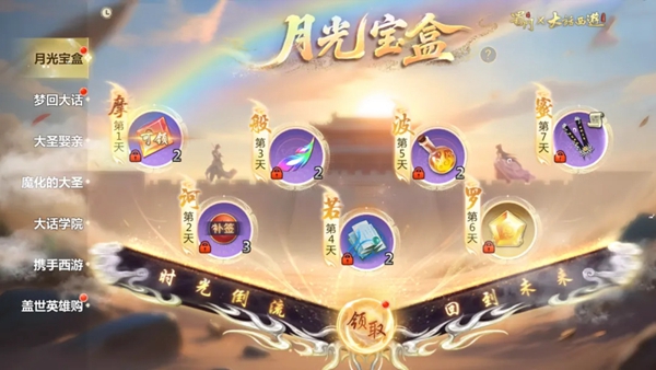 活动内容:每日登录游戏都能领取丰厚的资源奖励,累计登录7天即可免费领取联动限定背饰月光宝盒。若漏签可花费少量钻石补签。