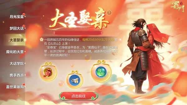 现在登录游戏即可领取联动限定背饰月光宝盒;参与梦回大话活动集齐材料兑换礼盒,打开就有机会获得联动限量定制周边;全服一起挑战魔化大圣赢取海量资源宝箱;参与大圣娶亲巡游,海量红包领不停;