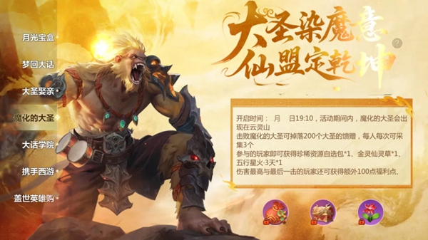 活动内容:受到魔气感染的大圣将在活动指定时间内出现在云灵山,请全服玩家前往镇压!参与击败的所有玩家都可以获得珍稀资源自选包和金灵仙灵草,造成伤害最高和最后一击的玩家还将额外获得福利点奖励!