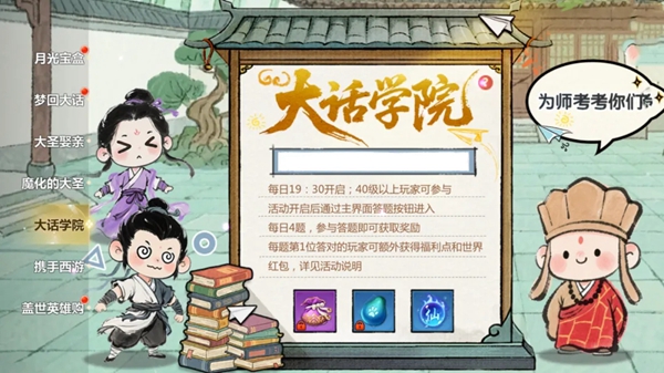 活动内容:在活动时间内,可以通过主界面主界面答题按钮或世界聊天频道打开答题界面进入,每次答题均可获得日常资源自选包、丰厚的经验、灵力等奖励!