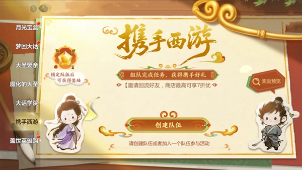 活动内容:活动期间,可邀请其他人结成小队,以小队形式每日完成天书活跃、帮会开树、英雄副本等指定任务后,获取积分领取进度奖,兑换指定商店中的物品道具。若队伍中有回流玩家,队伍全员还可以获得兑换商店超值折扣福利!