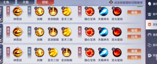 搭配一:1技能选择剑舞,2技能选择天圣三剑,3技能选择圣剑制裁,这套选择适用于打BOSS的时候,伤害比较高,而且出手速度快,在圣剑制裁的加成下,可以省点时间打出更多的普攻。