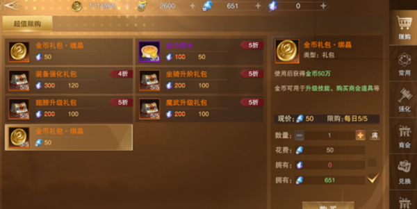 《新神魔大陆》的金币主要通过参与各种活动获取,包括主线任务,活力值系统也会奖励一些金币。同时,商城还限量出售金币礼包,每天可以用绑定魂晶购买5次礼包,每50绑定魂晶就能买到50W金币,比较缺金币的玩家每天别忘了买!