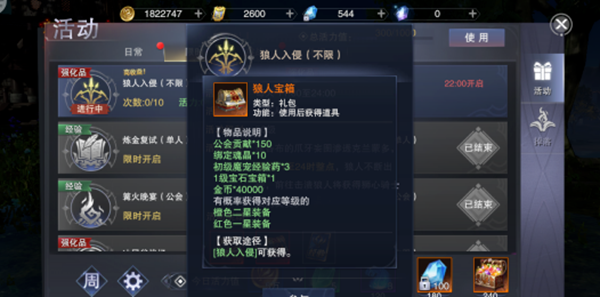 一个是每天11:00—24:00进行的【狼人入侵】活动,不需要排名,不需要抢怪,自动打怪就能完成,其中“狼人新兵”可以单人挑战,每个奖励4W金币和10绑定魂晶,每天10次就能得到40W金币和100绑魂晶奖励,美滋滋!