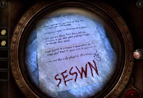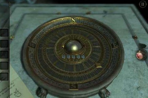 小球就装在这个巨大的指南盘。不过还不知道密码呢,其实就在一开始看的那封信上,只不过要用目镜看。始终在The Room系列中,普通纸质信件包含过关信息的情况其实很少见,但这里就有一个。