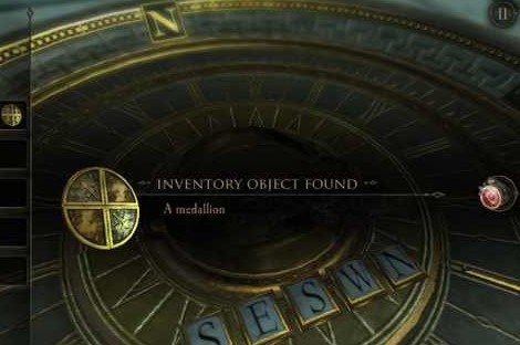 23、将罗盘插入另一个插槽,第二把锁解锁。在第二把锁解锁后,弹出一个齿轮装置。扭开螺丝以后,将弹出一组齿轮和两个按钮,分别按按钮调整齿轮的位置,将其相对调整成长方形。并获得一把钥匙。