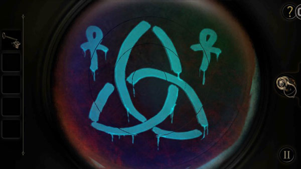 记得镶嵌在八角桌上的三个图案吗?拉近奇怪的投影仪或者说探照灯,戴上目镜,去找这三个图案吧!第一个在左中,类似Z字母翻转过的图案。