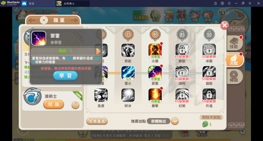 角色达到30级并通过指定任务后,还可以解锁「职业专精」与「转职」的功能。解锁「职业专精」功能后,可以在「职业」视窗里查看并切换职业专精。每一个职业都有两种专精,这两种专精在技能数量、技能升级、职业进阶等方面上都一模一样。切换专精后,游戏系统将会自动从玩家的背包里选出符合新专精的武器,但玩家将得自行替换装备的宝石。