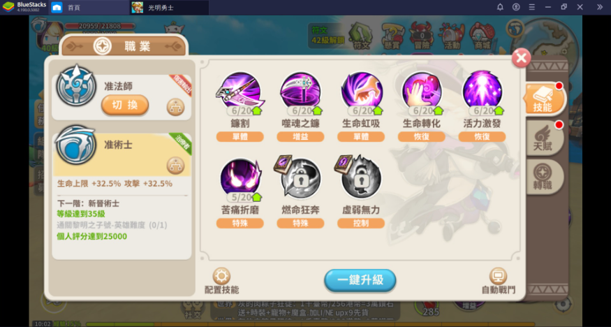游玩《光明勇士》过程中,当玩家满足特殊的条件时,可以接取并进行「晋升之路」的任务。完成「晋升之路」的任务后,便可以进行职业晋升,晋升后可获得新的职业称号以及职业属性加成。任何一种职业都可以进行8次职业进阶。另外,达到指定的职业阶级时,还可以解锁新的职业技能。