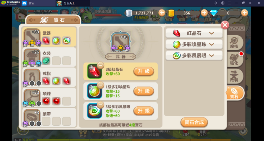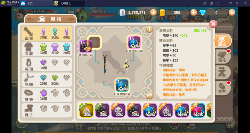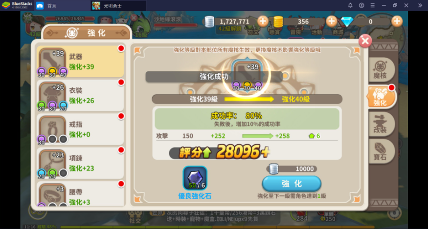 消耗一定量的金币与「强化石」时,便可提升装备部位的等级与其属性加成