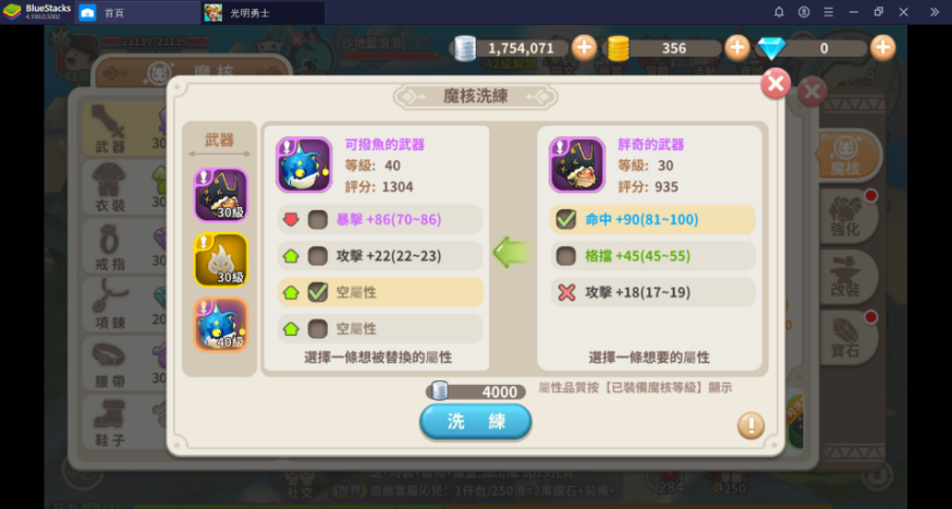 玩家可以透过「洗练」来将某个魔核上的属性转移到另一个魔核