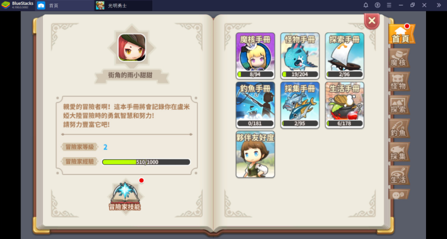 游玩过程中,当玩家满足击杀怪物、采集植物、挖掘矿物、钓鱼或者制作道具等方面的特殊条件时,将可以在「手册」视窗里领取对应的奖励。每一次「手册」任务时,便可以获得冒险家经验值。冒险家经验值集满时,便可以提升冒险家等级并获得「勇士徽章」。消耗「勇士徽章」时可以习得或者升级冒险家技能,进而获得各种属性加成。