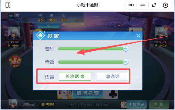 2、点击语言栏的长沙话,当选中以后颜色为绿色,即为切换成功,之后游戏内所有出牌操作和背景旁白部分,都是长沙话的形式呈现啦。